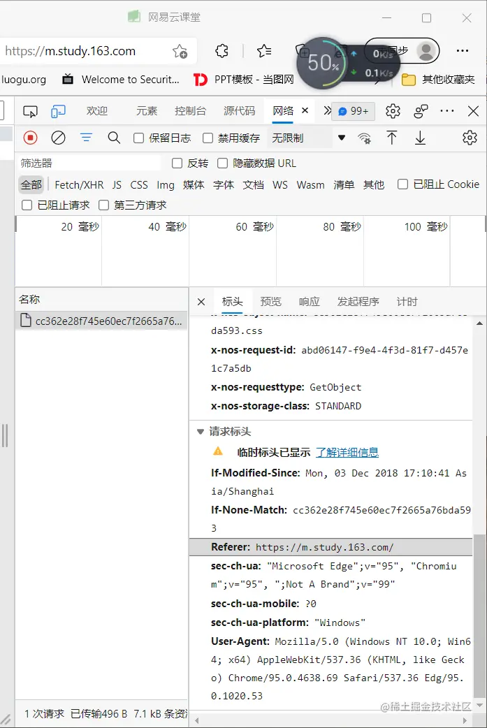 我们通过m.study.163.com/直接跳转到页面。和从bing主页搜索云课堂再进入,开发者工具中显示的HTTP请求是不同的,后者会多一个Referer头,表示是从bing的这个链接来的。