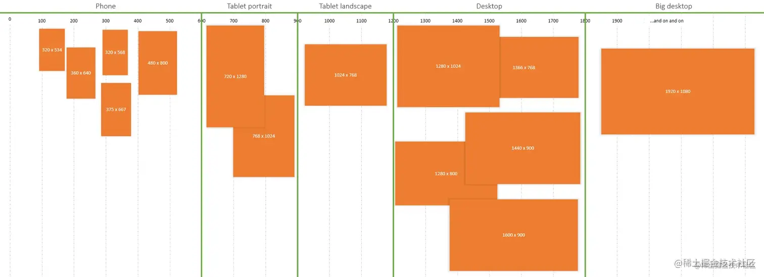 如果我们选择600px,900px,1200px,1800px作为分割点,可以适配到常见的14个机型: