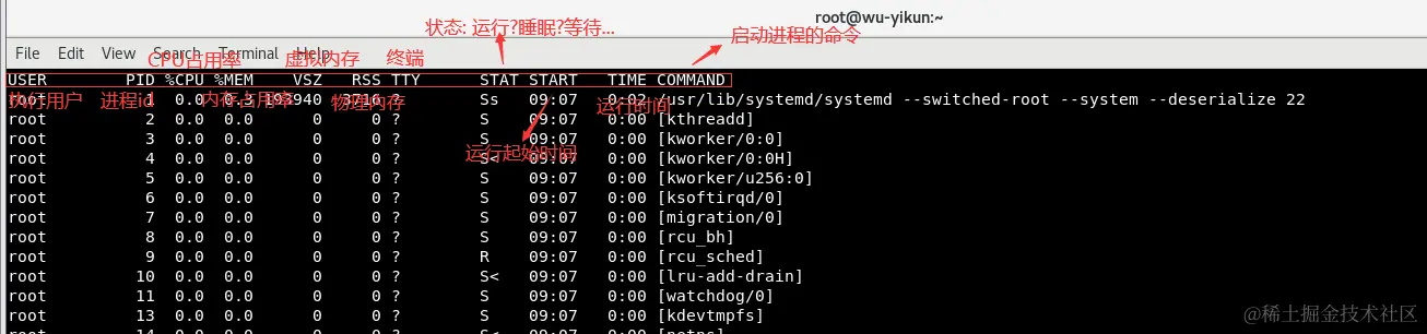 ps命令是用来查看目前系统中,有哪些正在执行,以及它们的执行状况,可不加参数- 最常用命令: