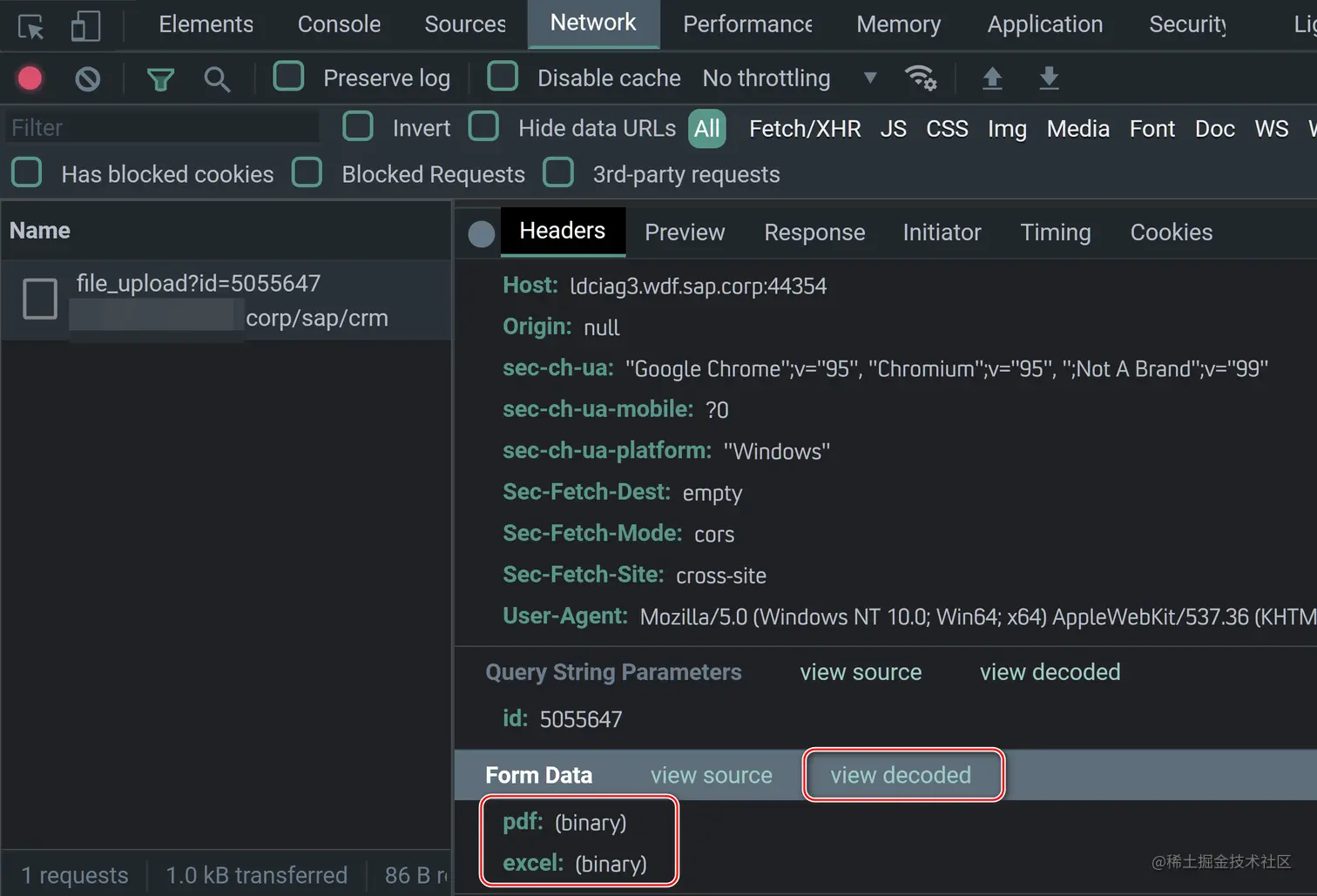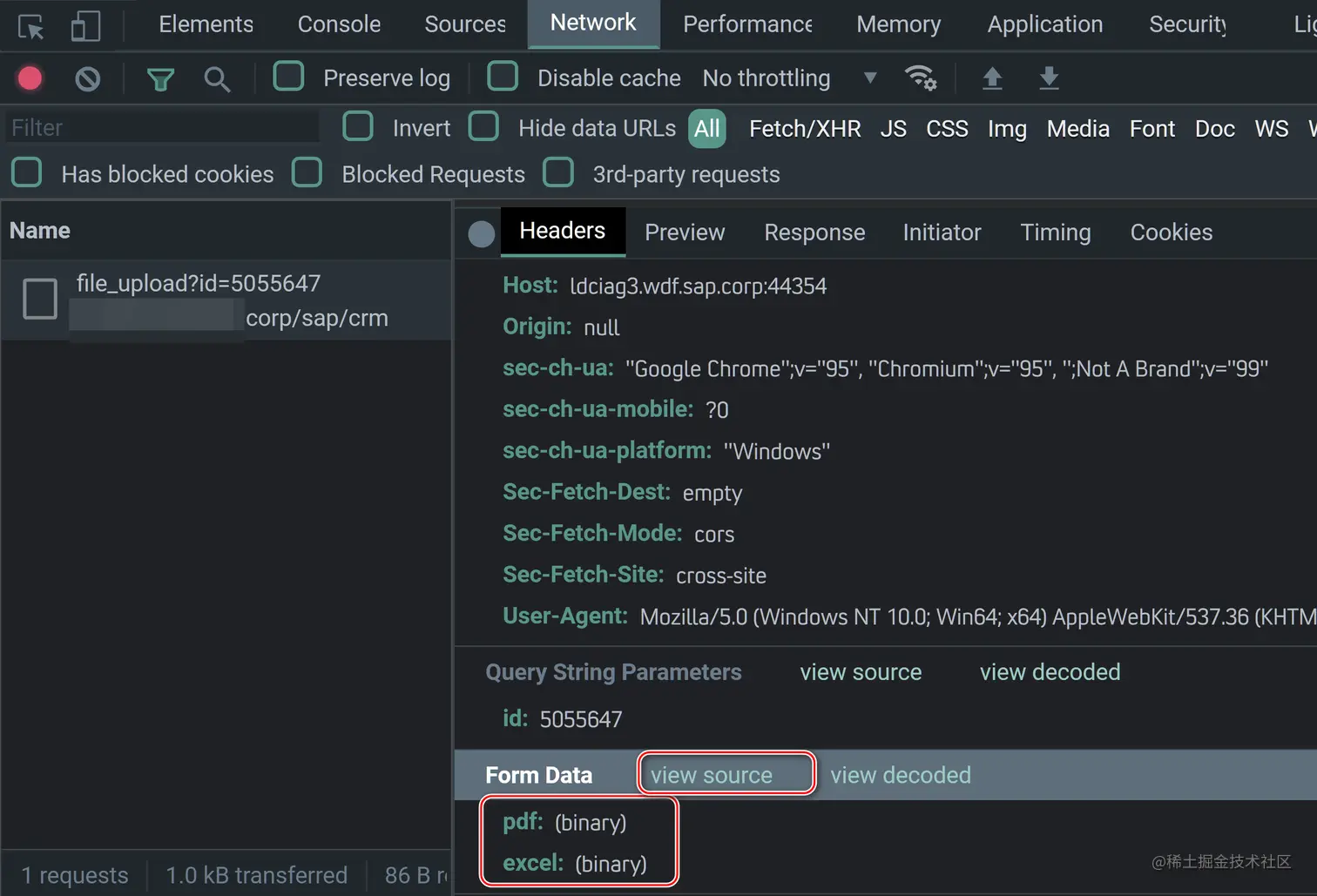 我们仍然可以在 Chrome 开发者工具里观察到上传的 PDF 和 Excel 的文件名和 Content-Type 即文件类型。同前文上传文本文件的例子不同,这里无法看到两个文件的二进制内容——这些二进制内容可以在 ABAP 服务器端调试器里观察到。