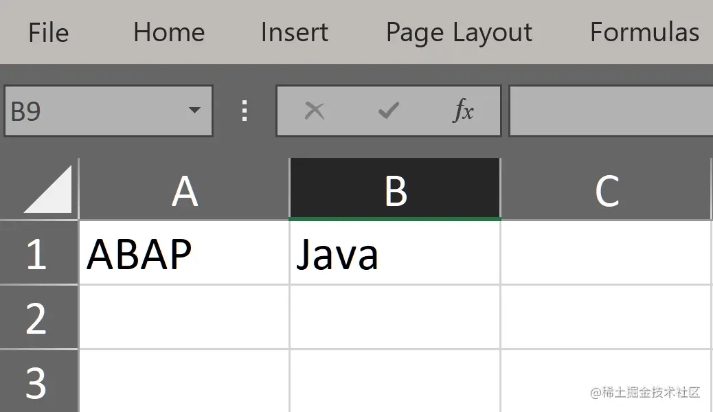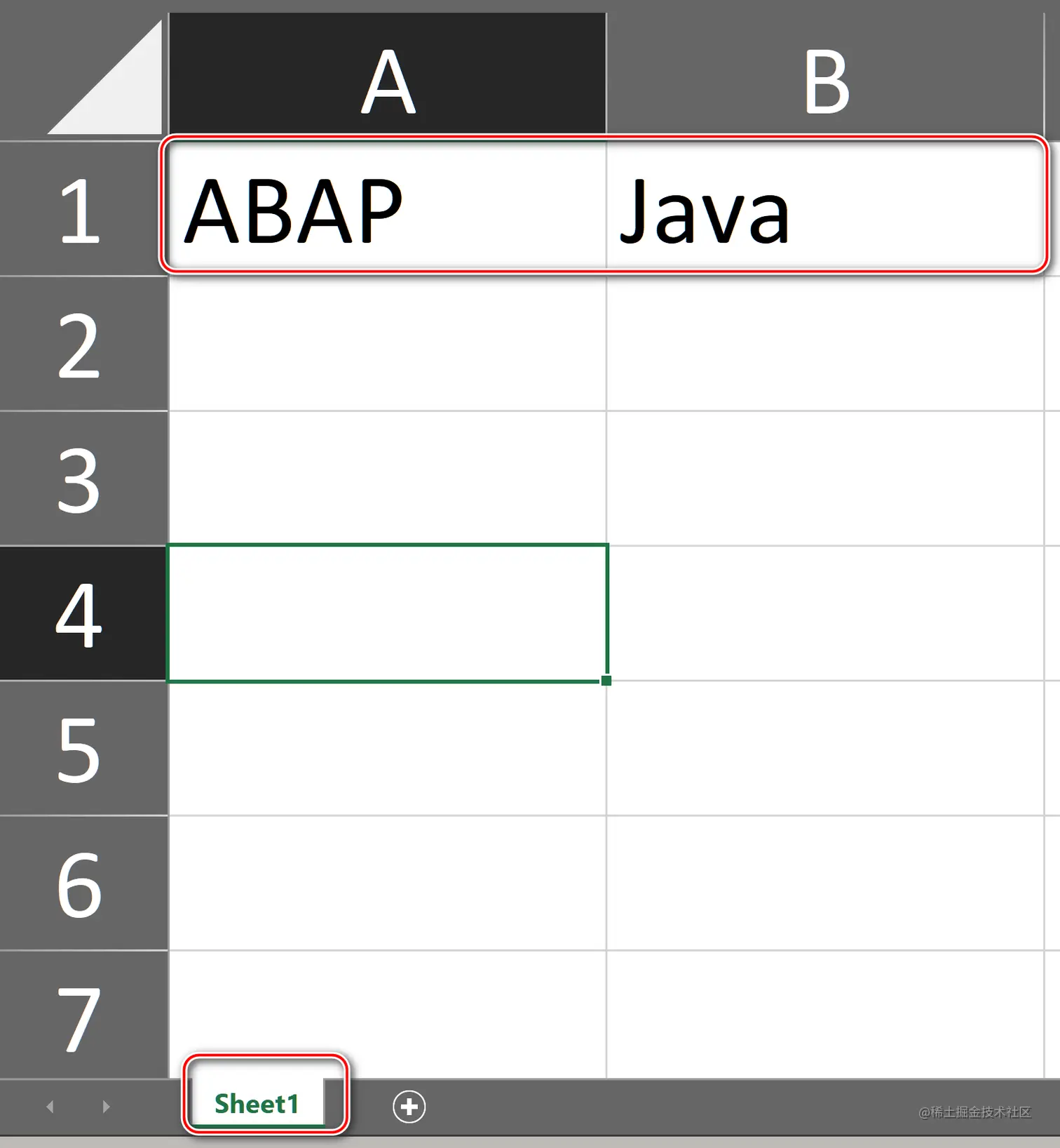 上图 Excel 文件有一个名为 Sheet1 的内容页,A1 值为 ABAP,B1 值为 Java,这个信息维护在解压出来的 worksheets 文件夹的子文件 sheet1.xml 内: