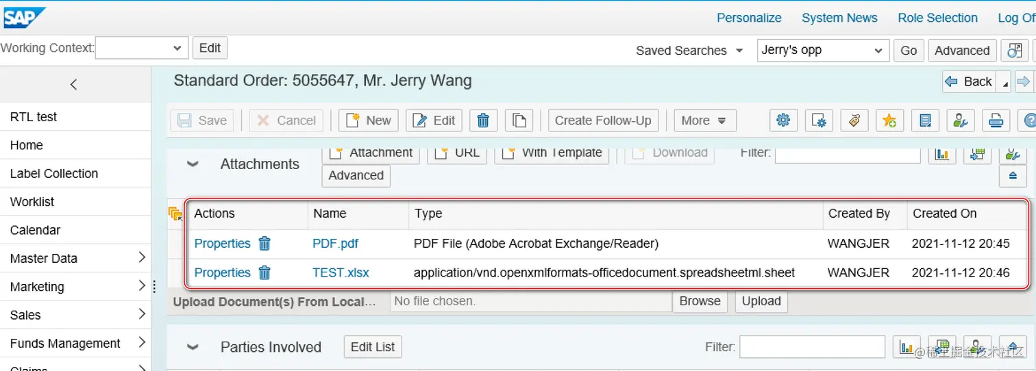创建好的 PDF 和 Excel 附件在 SAP CRM 系统里显示如下: