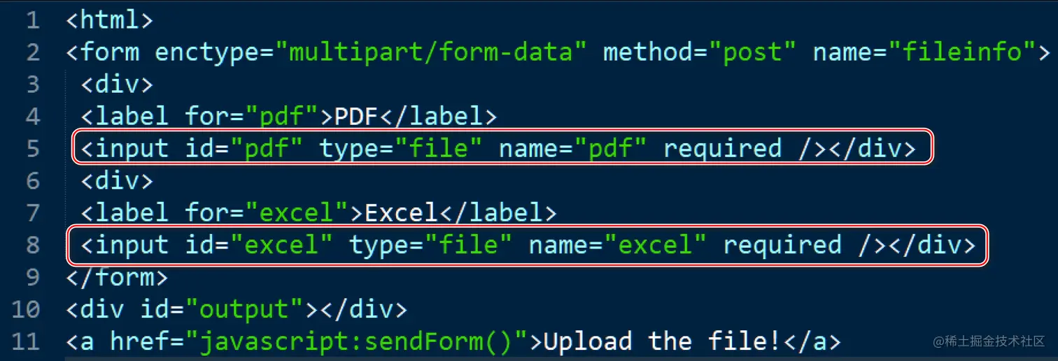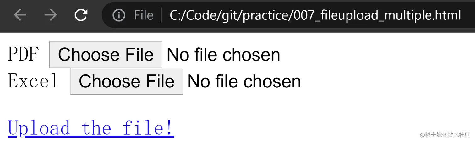 我在前文例子的基础上稍作修改,在 Form 里使用两个类型为 file 的 input 标签,分别上传 PDF 和 Excel 文件: