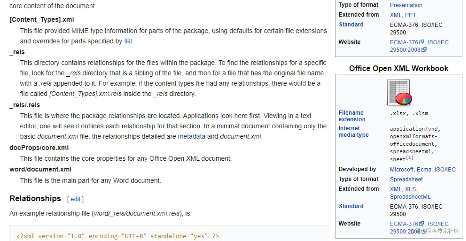 可以在 WikiPedia 里找到 Open XML Formats 协议定义的每个文件的作用: