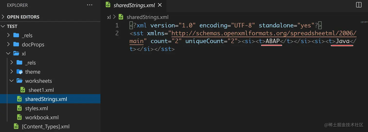不难发现,sheet1.xml 里并未直接将 ABAP 和 Java 的字符串字面量在内,而仅仅存放了其索引,0 和 1. 做过 Java 开发的朋友,可以把这种设计类比成 Java 的字符串常量池。