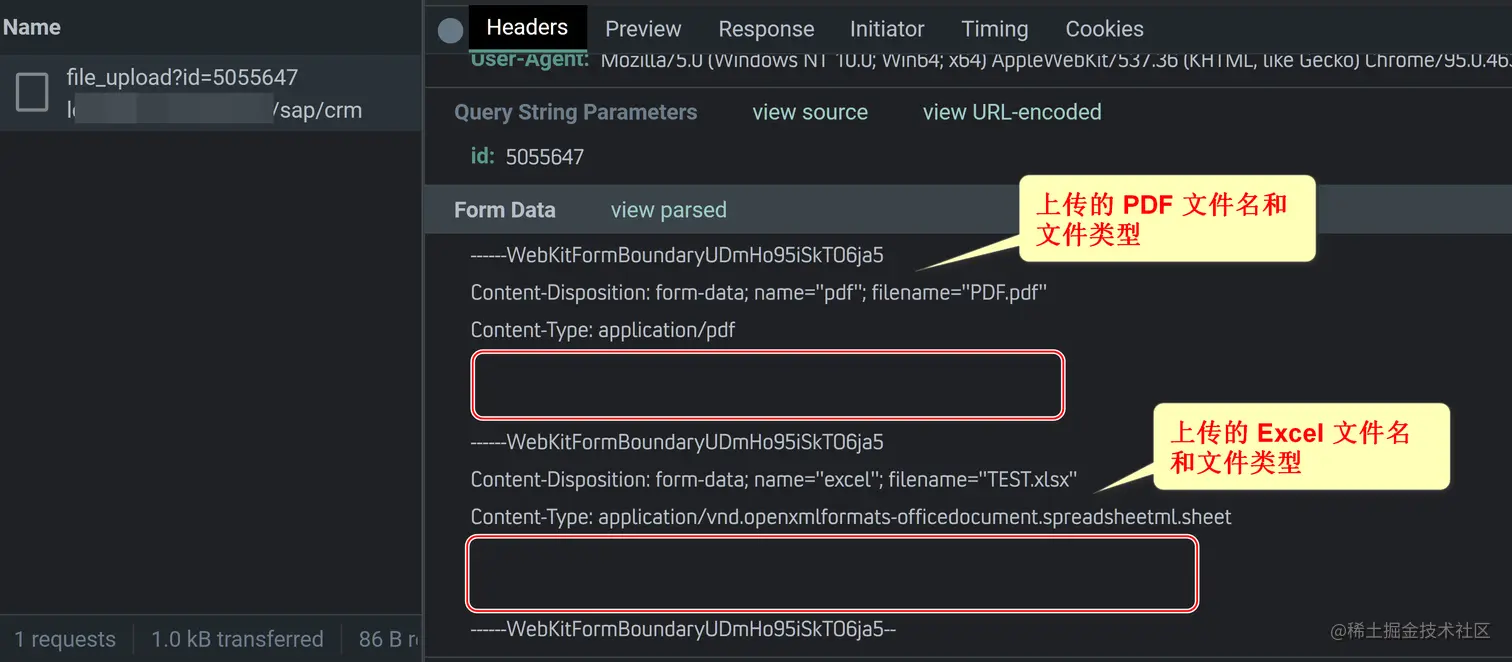 点击 HTML 页面上传文件的超链接,在 Chrome 开发者工具观察到 HTTP POST 请求的负载,包含了 PDF 和 Excel 两个 input 控件包含的二进制流(stream):
