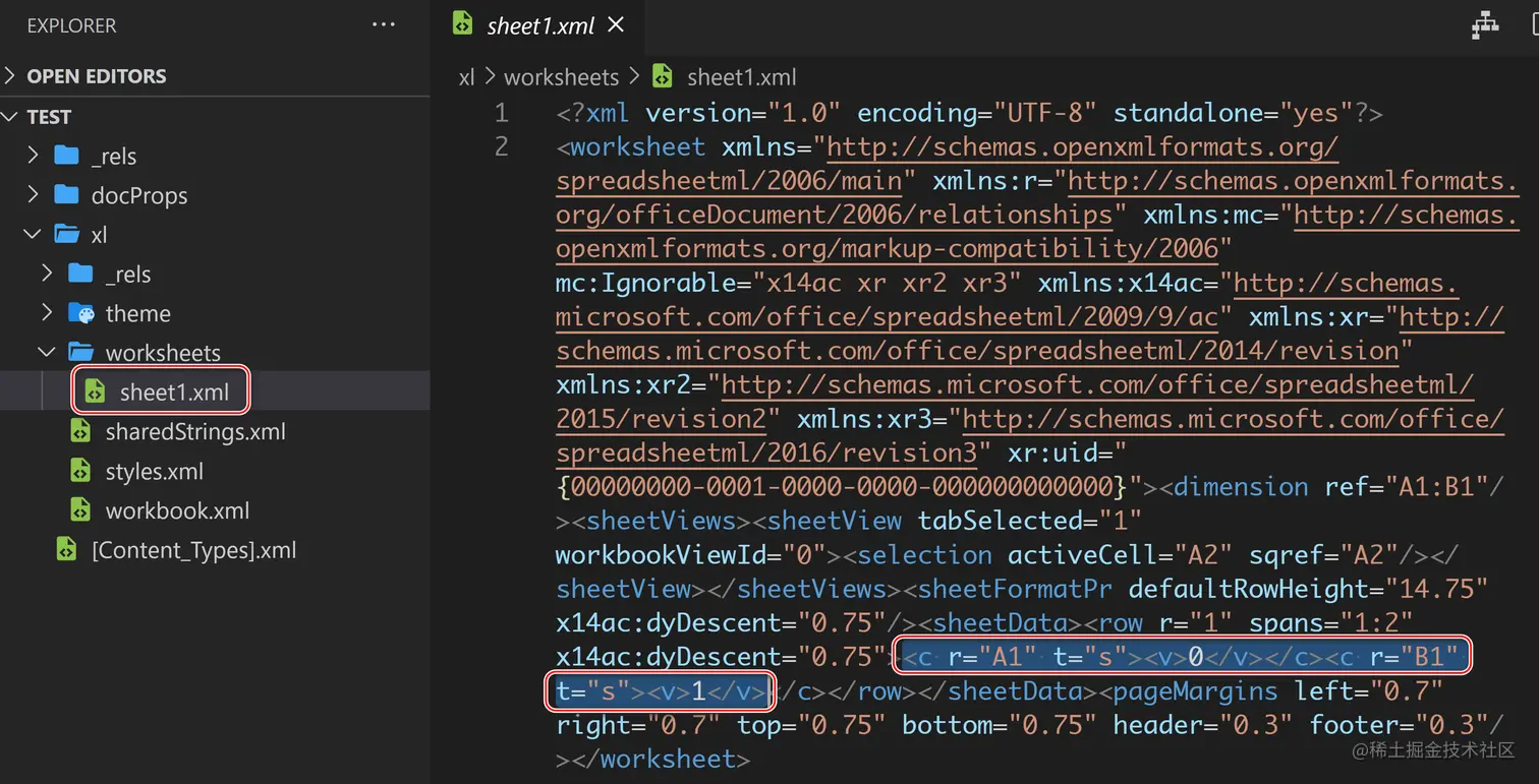 在解压出的文件夹里有另一个文件 sharedStrings.xml, 顾名思义,维护了 Excel worksheets 里出现的所有字符串,用于在 sheets 之间共享。每个单独的 sheet xml 文件只维护使用到的字符串的索引,以减小 Excel 文件的尺寸。