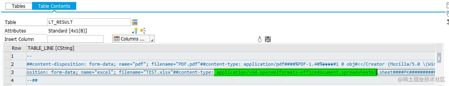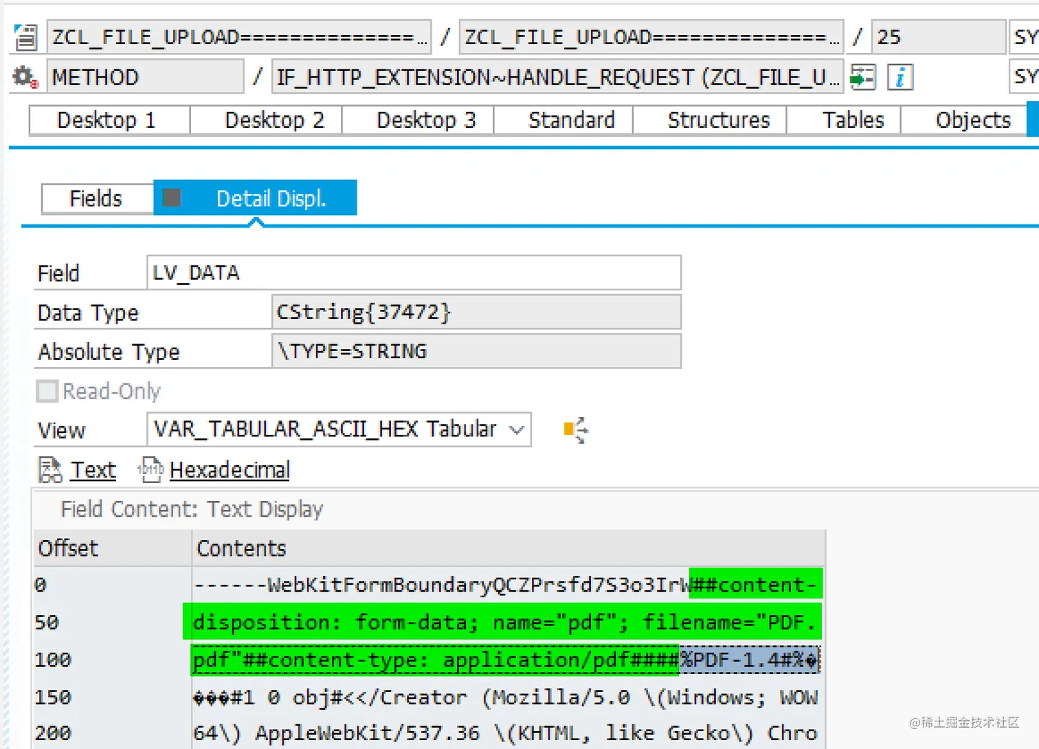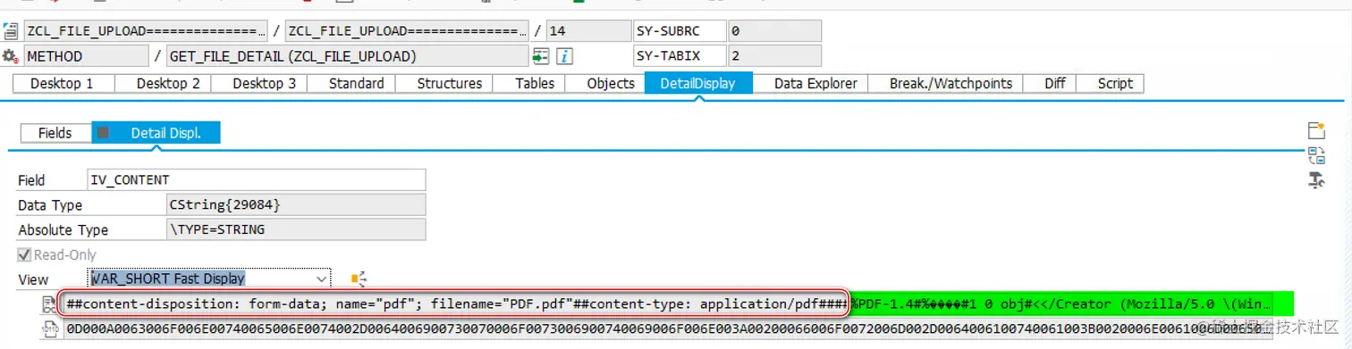 以上传的 PDF 文件为例,在 ABAP 服务器端接收到的 form-data 数据,如下图所示,绿色高亮区域即为上图 Chrome 开发者工具里能够观测到的文件名 PDF.pdf 和文件类型 application/pdf, 而%PDF-1.4# 开头的,就是 PDF 文件的二进制内容。