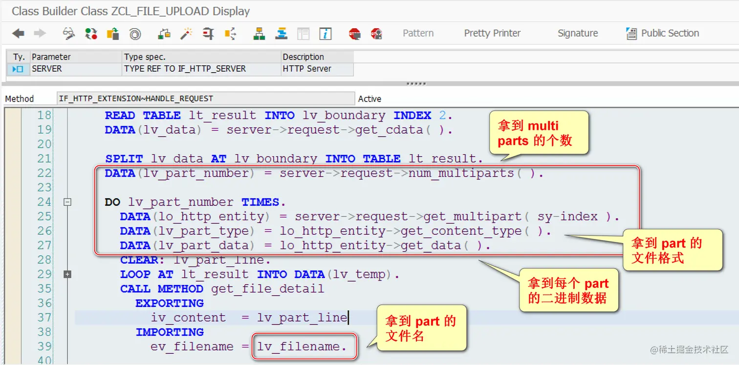 当 ABAP 服务器接收到的客户端数据格式为 multipart/form-data 时,调用 CL_HTTP_REQUEST 的num_multiparts 方法可以得到 parts 的个数,再使用 get_multipart 方法,传入每个 part 的索引,就可以得到代表这个 part 的一个实例引用。