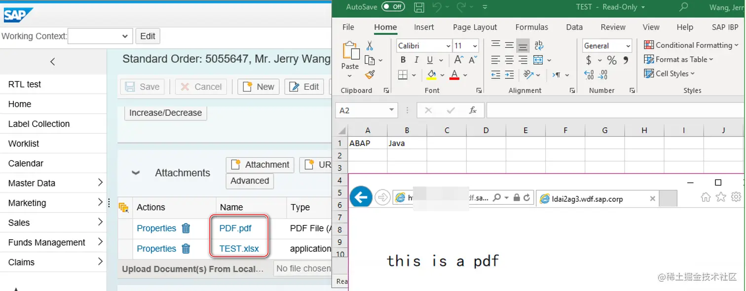至此调用 SAP CRM 附件创建 API 的三大参数:文件名,文件类型和文件二进制内容均已就绪,调用 API 即可将上传的 PDF 和 Excel 数据,创建成为 SAP CRM 销售订单的附件。