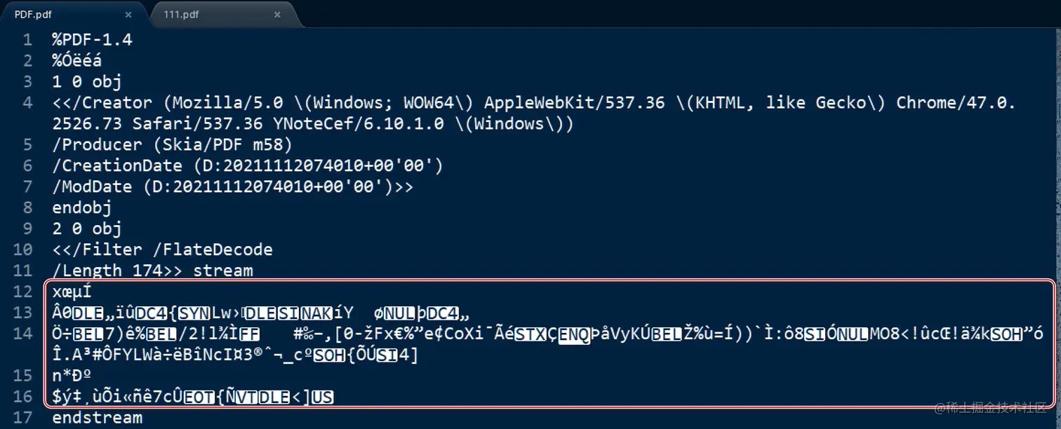 准确的说,PDF 格式是文本和二进制流的混合模式。用文本编辑器打开 PDF.pdf, 能看到其文件头部包含的是文本字符描述的文件元数据,比如该文件的创建和修改时间,创建该文件的工具名等等,后半部分才是二进制流。