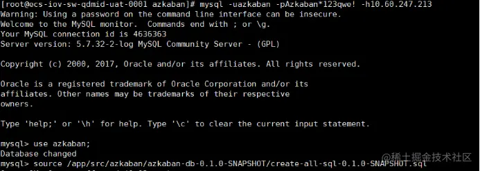 [hdfs@ecs-iov-sw-qdmid-uat-0001 bin]$ mysql -uazkaban -pAzkaban*123qwe! -h10.60.247.213
