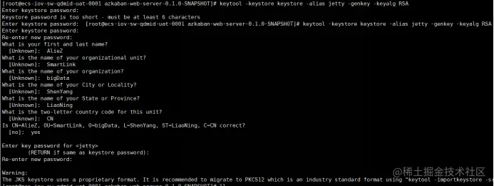 [hdfs@ecs-iov-sw-qdmid-uat-0001 azkaban-web-server-0.1.0-SNAPSHOT]# keytool -keystore keystore -alias jetty -genkey -keyalg RSA