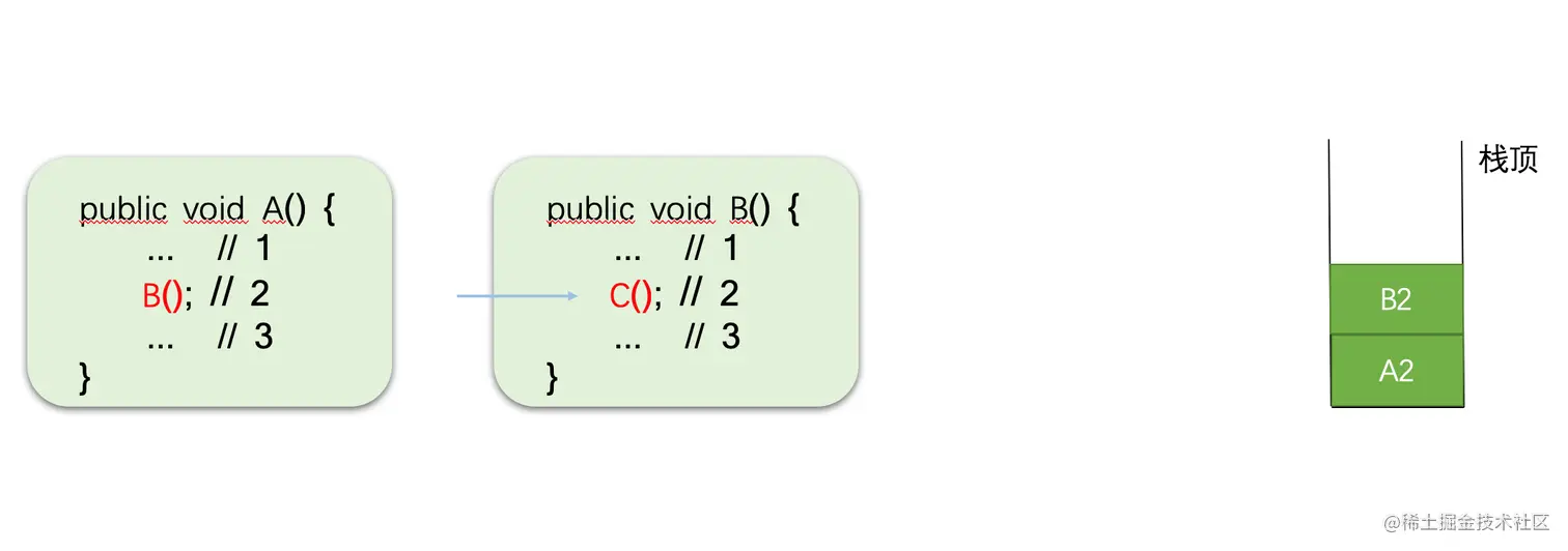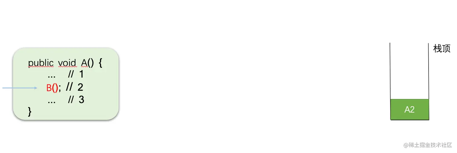 当程序执行到A()方法的中的第二行时,此时程序会中断A()方法并开始调用B()方法,然后会在虚拟机栈中记录调用B()方法的栈帧,我这里暂且称之为A2(实际存储的并不是O(∩_∩)O哈!)示意图如下: