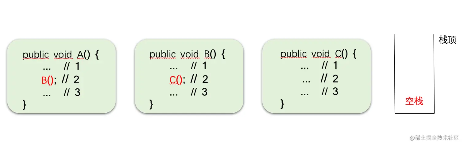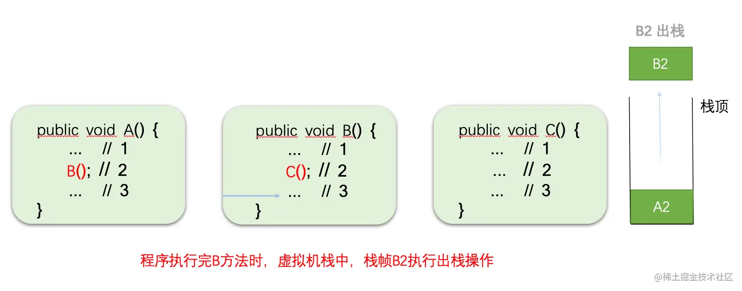 此时就要查看一下虚拟机栈了,发现虚拟机栈,栈中栈顶的元素是B2,我们的程序就知道了,它是执行到B()方法的B2位置就中断了,去执行C()方法了;现在C()方法执行完成之后,它就可以跳回到B2的位置继续执行了,当B()方法执行完之后,虚拟机栈中的B2栈帧也就可以出栈了,依次类推....