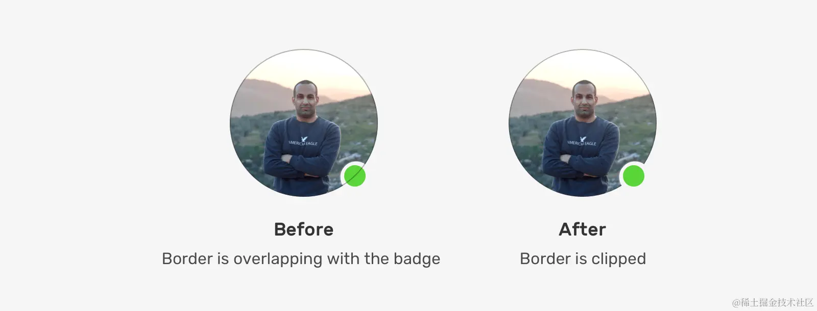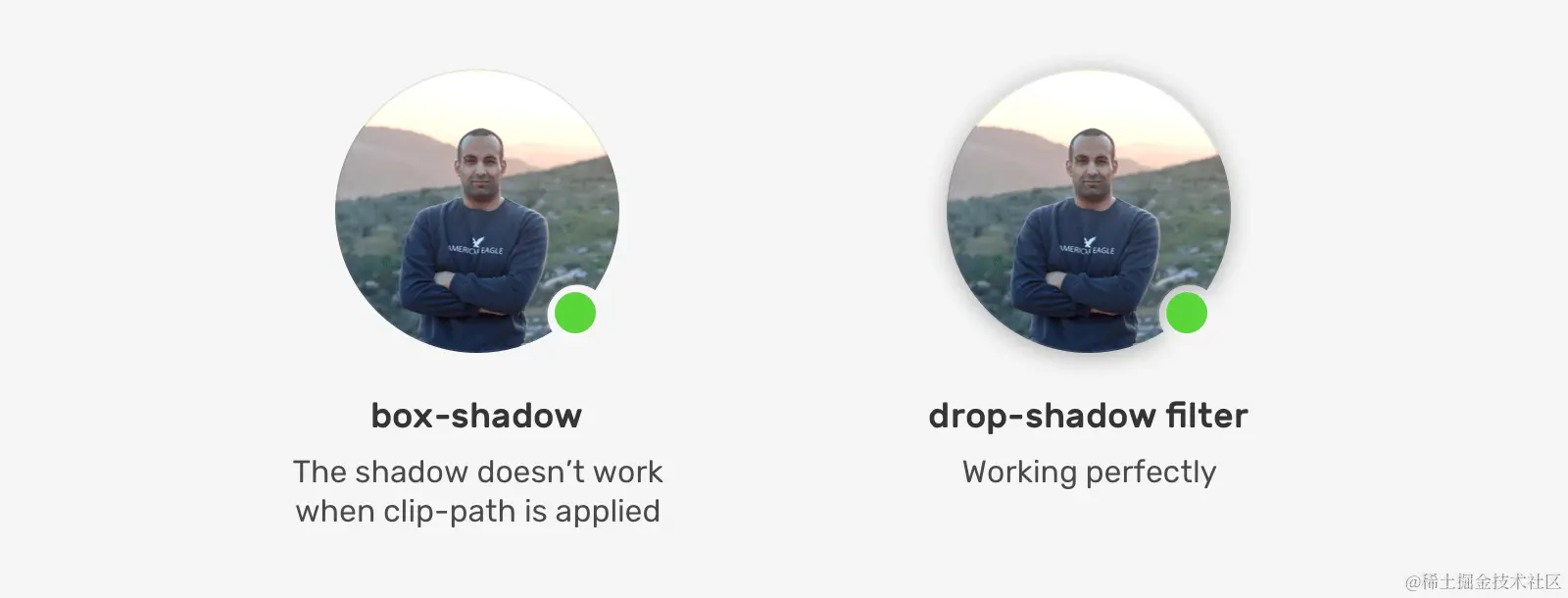 最后我想验证的一件事是添加阴影的能力。可以使用 CSS filter drop-shadow,最棒的地方是它会按照头像的剪裁形状。