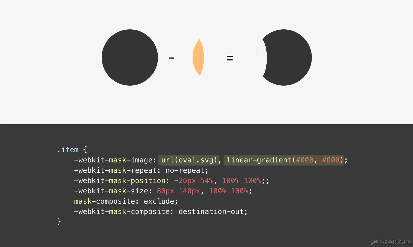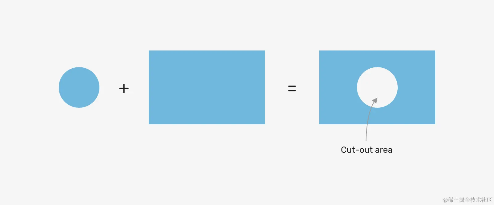 请注意,我们通过从矩形中减去圆形来切出一个孔。在设计应用时,这很容易做到。然而,当要在网页上实现类似的效果时,由于各种原因,可能会变得有点挑战: