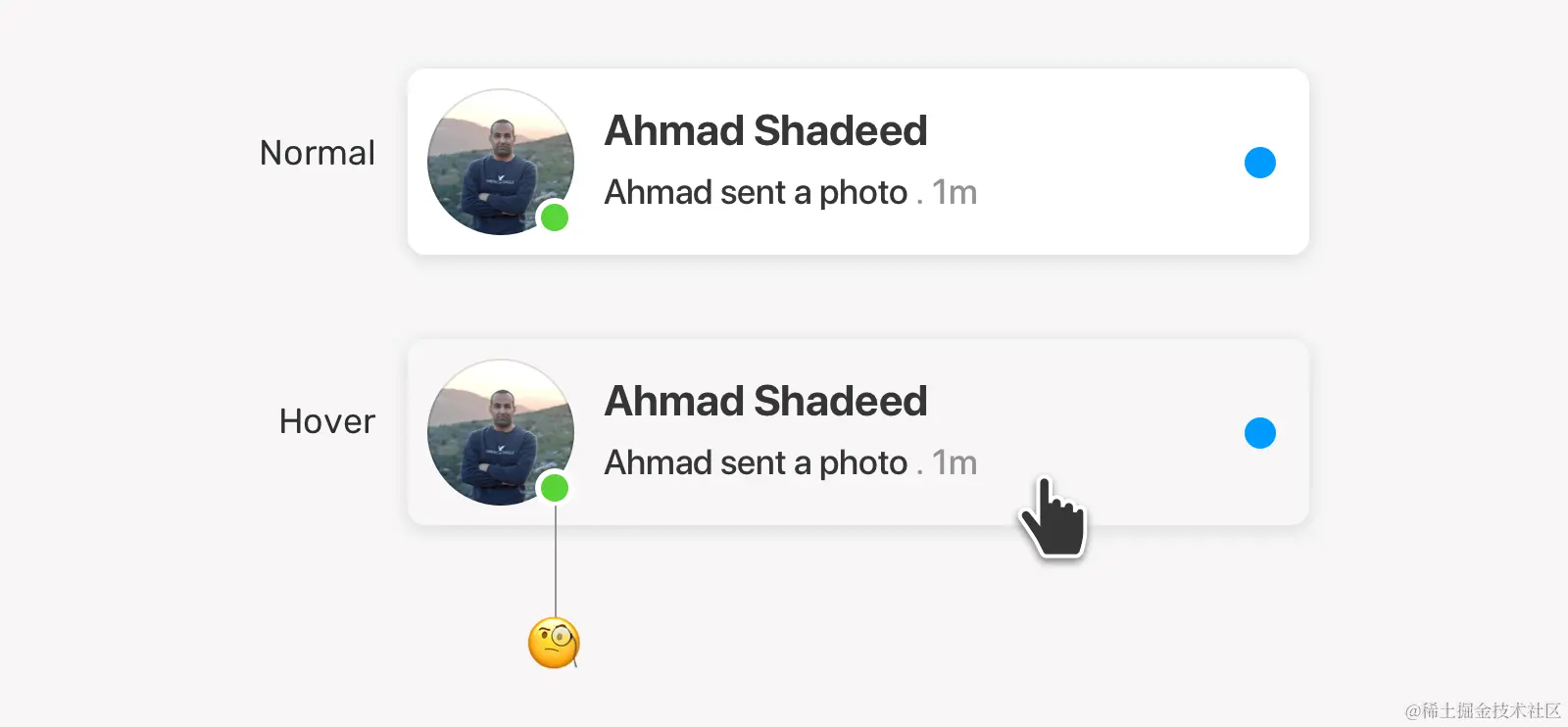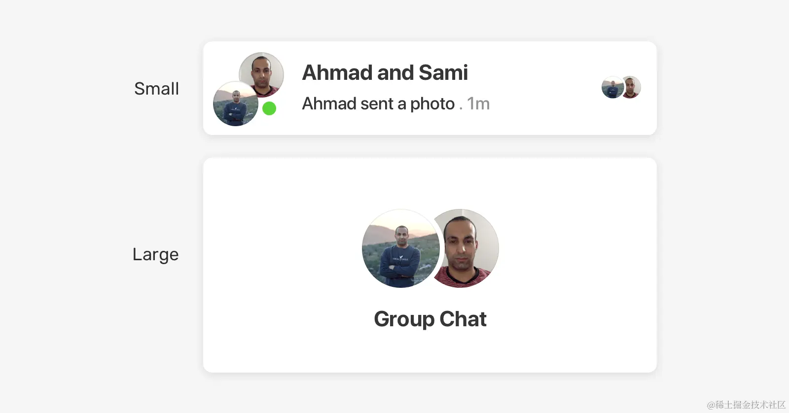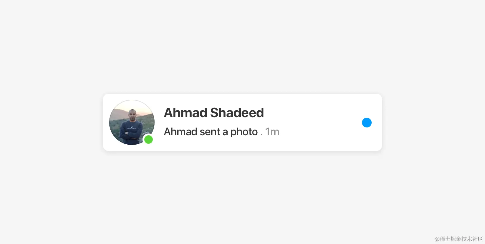 这是取自 Facebook Messenger 的真实案例。用户头像可以具有指示用户当前在线状态的绿色圆点。让我们来看一下: