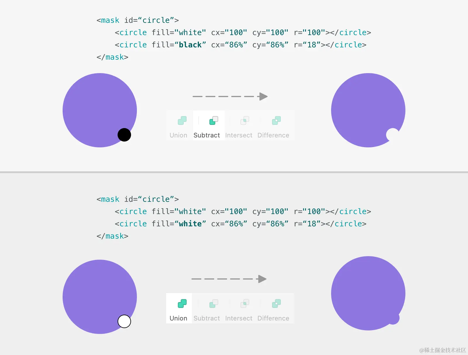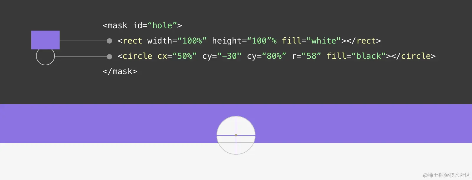 首先,让我解释一下 SVG 蒙版是如何工作的。我们需要创建蒙版,然后将其应用到 SVG 自身的某个位置。如下所示。