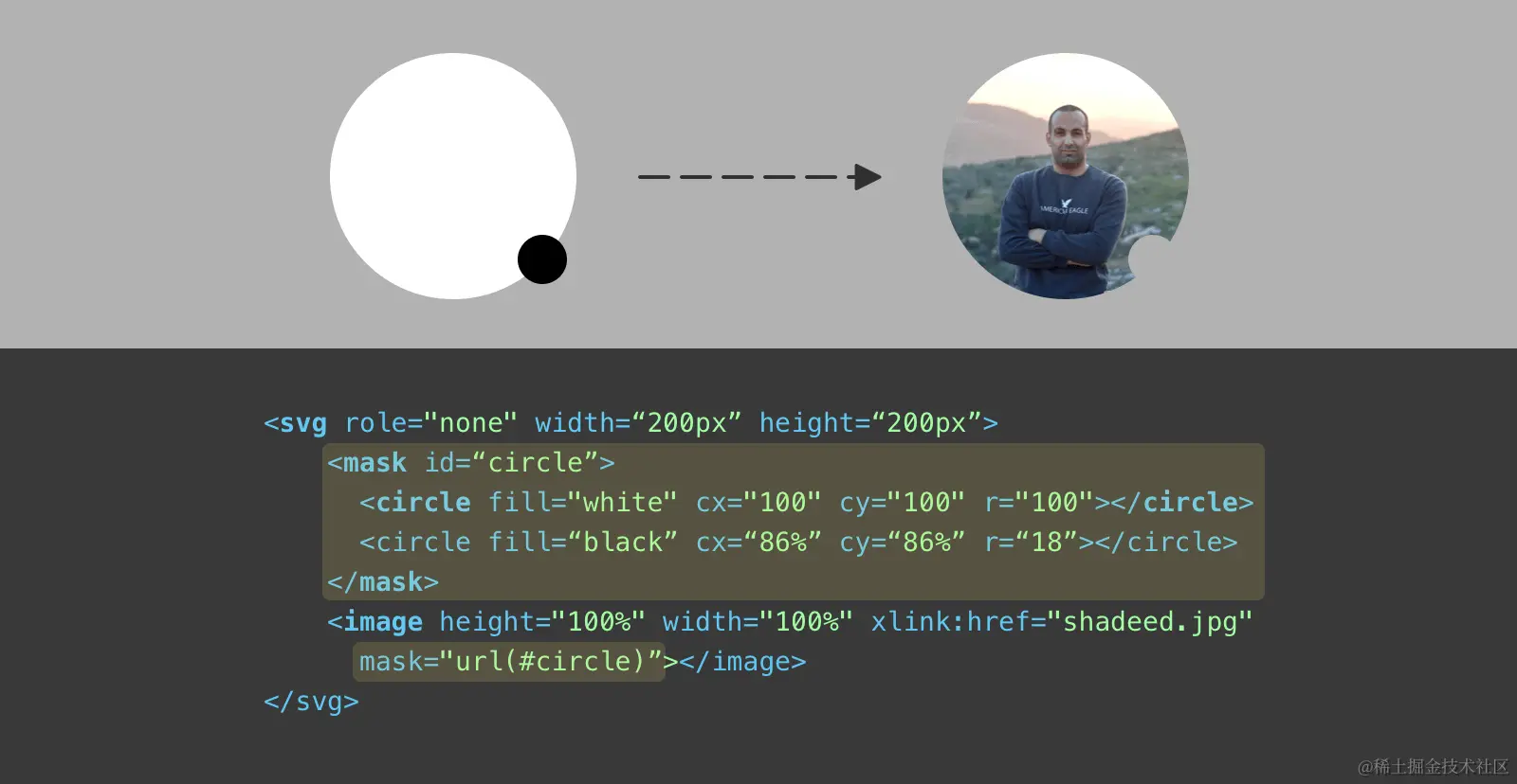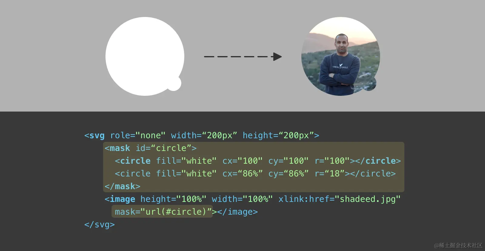 它只是一个被圆圈遮罩起来的图像。在 SVG 中,它与 CSS 蒙版不同(语法上)。我们来分析一下上面的代码: