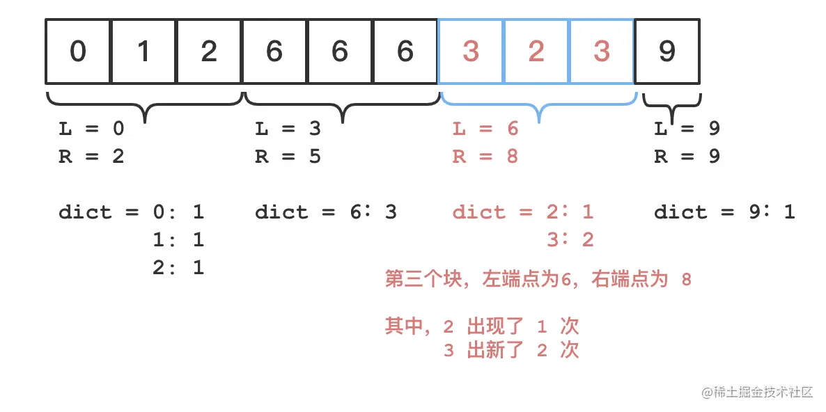 首先将 个数字,按位置均分为 个块,每块约有 个数字。