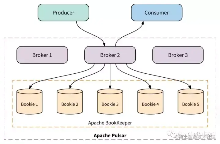 Broker集群在Apache Pulsar中形成无状态服务层。服务层是“无状态的”,因为Broker实际上并不在本地存储任何消息数据。有关Pulsar主题的消息,都被存储在分布式日志存储系统(Apache BookKeeper)中。我们将在下一节中更多地讨论BookKeeper。