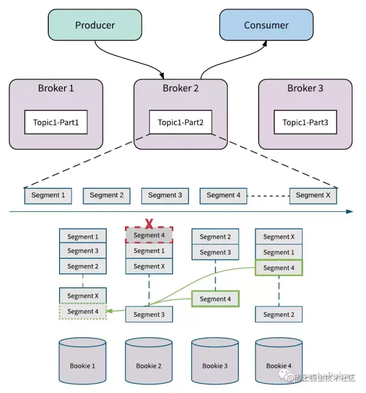 Apache BookKeeper中的副本修复是Segment(甚至是Entry)级别的多对多快速修复,这比重新复制整个主题分区要精细,只会复制必须的数据。 这意味着Apache BookKeeper可以从bookie 3和bookie 4读取Segment 4中的消息,并在bookie 1处修复Segment 4。所有的副本修复都在后台进行,对Broker和应用透明。即使有Bookie节点出错的情况发生时,通过添加新的可用的Bookie来替换失败的Bookie,所有Broker都可以继续接受写入,而不会牺牲主题分区的可用性。