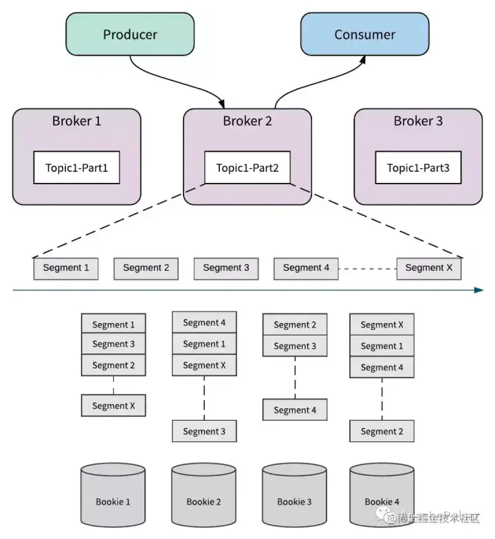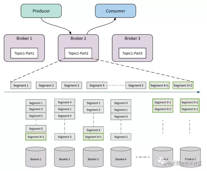 下面的图说明了一个分为x个Segment段的主题分区。 每个Segment段存储3个副本。 所有Segment都分布并存储在4个Bookie中。