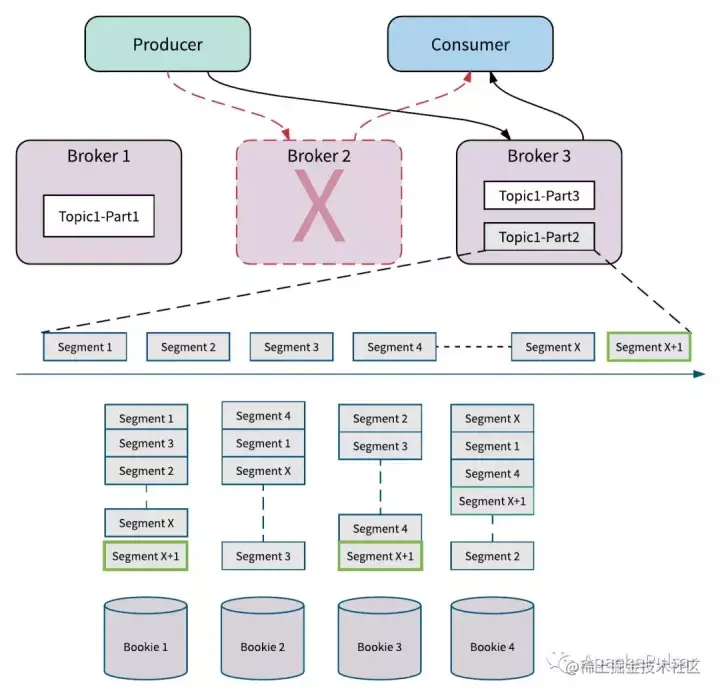 下图说明了Pulsar如何处理Broker失败的示例。 在例子中Broker 2因某种原因(例如停电)而断开。 Pulsar检测到Broker 2已关闭,并立即将Topic1-Part2的所有权从Broker 2转移到Broker 3。在Pulsar中数据存储和数据服务分离,所以当代理3接管Topic1-Part2的所有权时,它不需要复制Partiton的数据。 如果有新数据到来,它立即附加并存储为Topic1-Part2中的Segment x + 1。 Segment x + 1被分发并存储在Bookie1, 2和4上。因为它不需要重新复制数据,所以所有权转移立即发生而不会牺牲主题分区的可用性。
