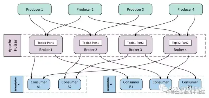 每个主题分区(Topic Partition)由Pulsar分配给某个Broker,该Broker称为该主题分区的所有者。 Pulsar生产者和消费者连接到主题分区的所有者Broker,以向所有者代理发送消息并消费消息。