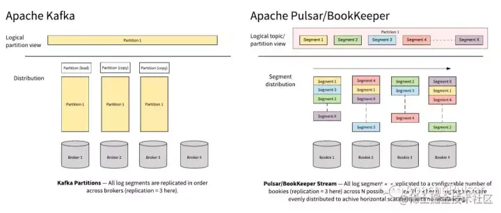 Apache Kafka和Apache Pulsar都有类似的消息概念。 客户端通过主题与消息系统进行交互。 每个主题都可以分为多个分区。 然而,Apache Pulsar和Apache Kafka之间的根本区别在于Apache Kafka是以分区为存储中心,而Apache Pulsar是以Segment为存储中心。