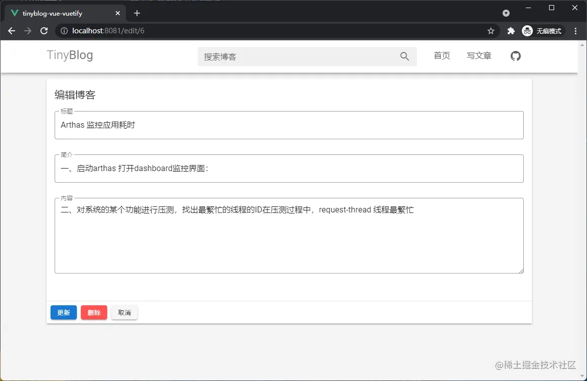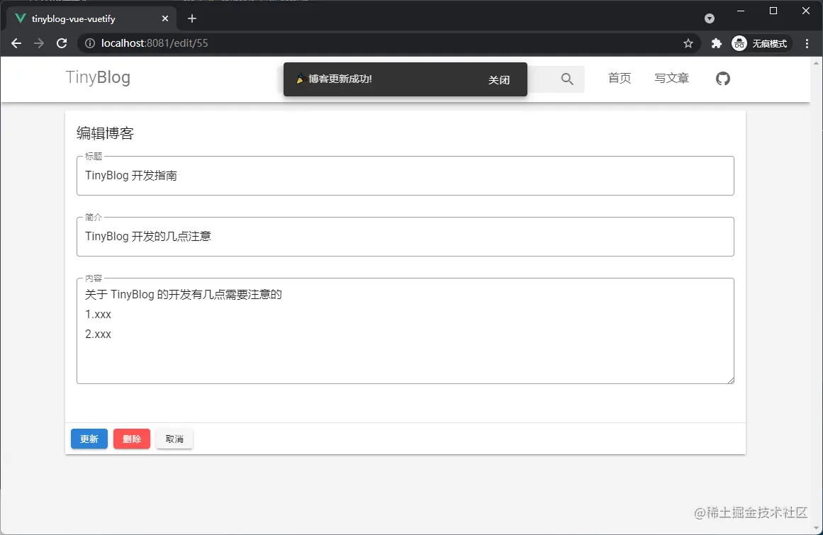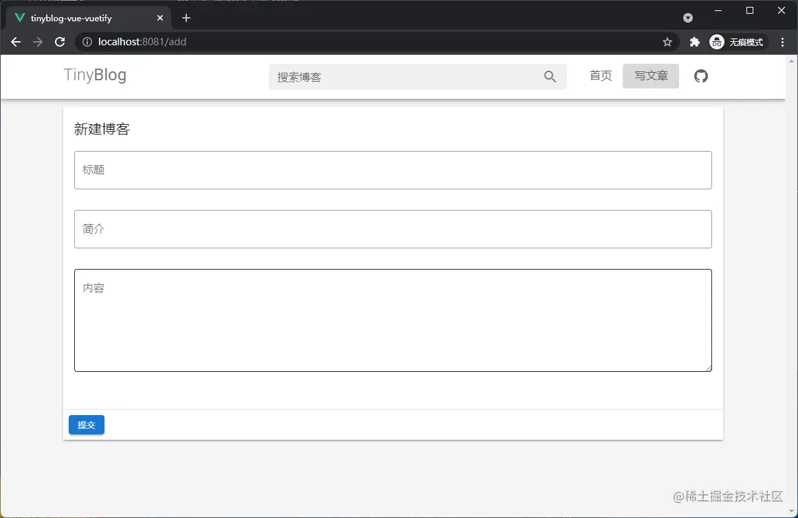 本文主要介绍了 TinyBlog 的前端开发过程,主要使用了 Vue + Vuetify 实现的。代码已经上传到我的 Gitee 仓库。