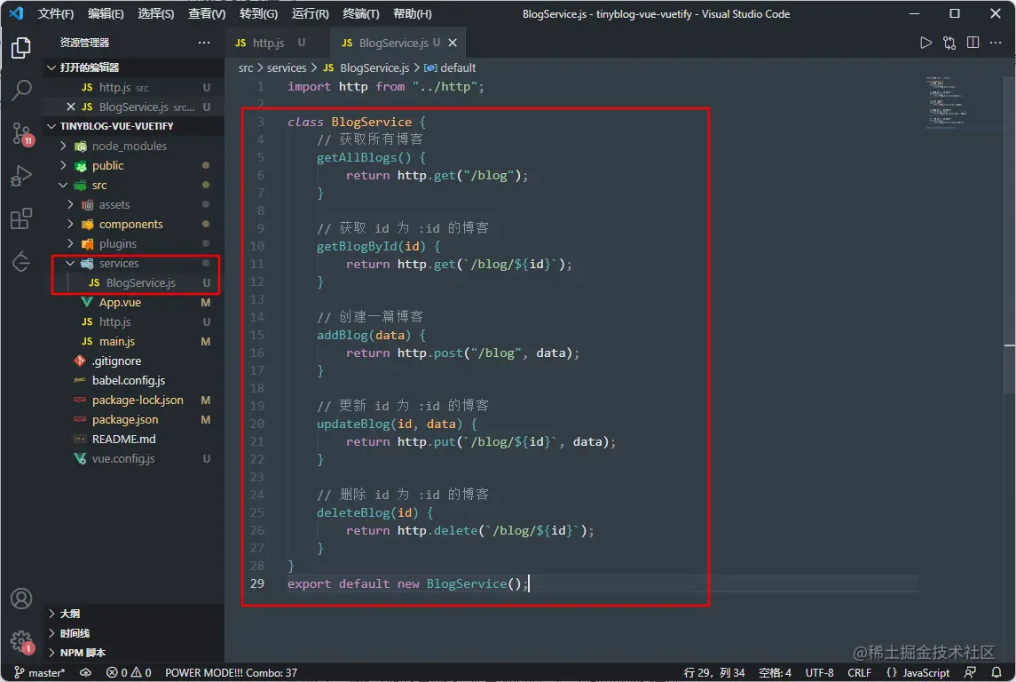 创建 src/services/BlogService.js 文件,封装后台接口。