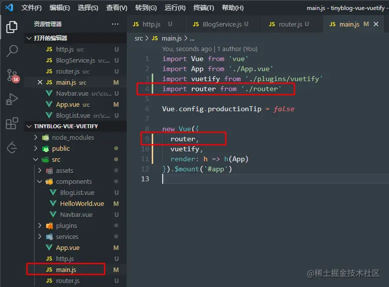 创建好 router.js 后,还需要在 main.js 中引入路由才能生效。(如果你正在运行,记得把 router.js 中的路由暂时注释掉,不然会报错找不到 Vue 组件)