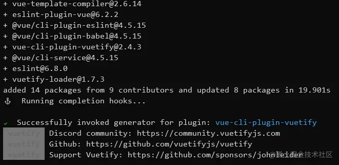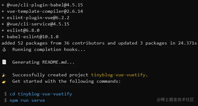 然后我们切换到工程目录 cd tinyblog-vue-vuetify/,通过 vue add vuetify 命令,添加 Vuetify。