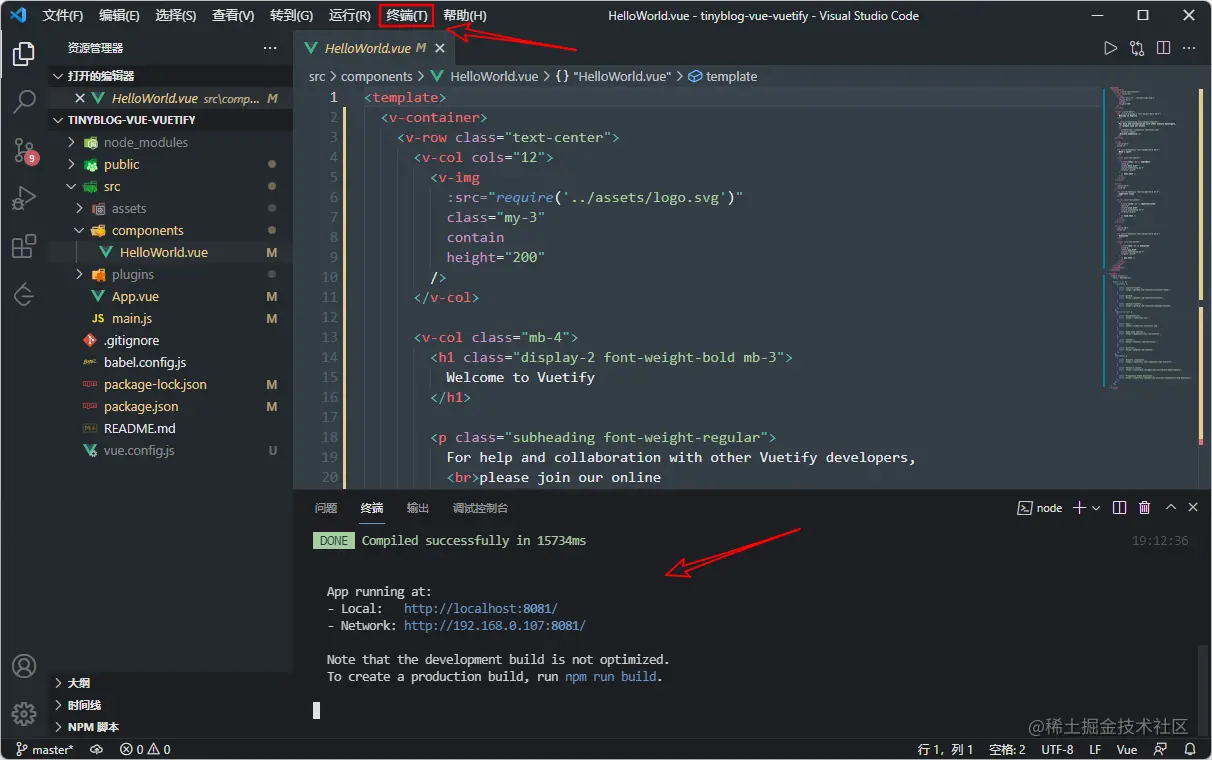最后,通过执行 code . 使用 VS Code 打开工程。我们可以通过 npm run serve 命令,启动应用。