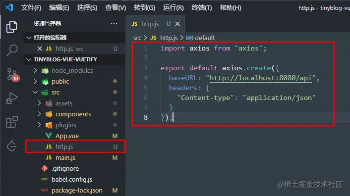 新建文件 src/http.js,封装 axios,定义后台接口地址。