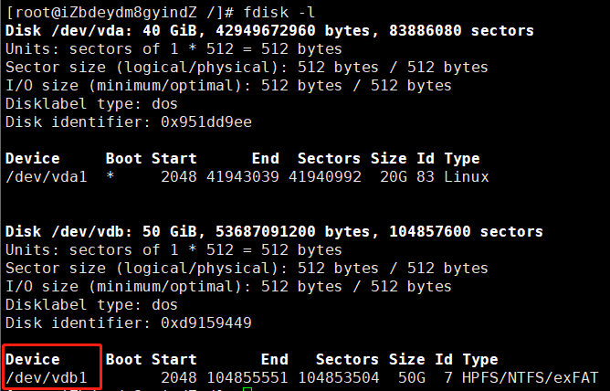 查看磁盘情况,本次机器系统盘为vda:40G,数据盘为vdb:50G