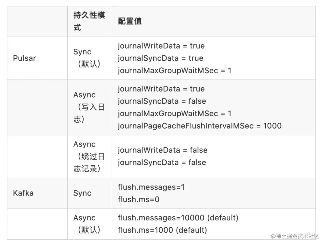 Pulsar 的新特性包括本地持久性模式(Async - Bypass journal)。我们利用此模式配置 Pulsar,保持与 Kafka 本地持久性默认级别相匹配。表 13 列出了基准测试的具体设置。