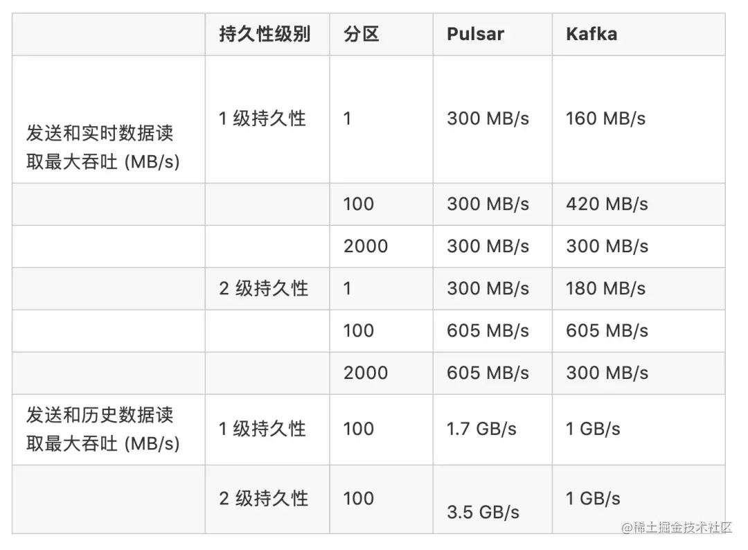 - Kafka 在一个分区上的最大吞吐量仅为 Pulsar 最大吞吐量的二分之一。