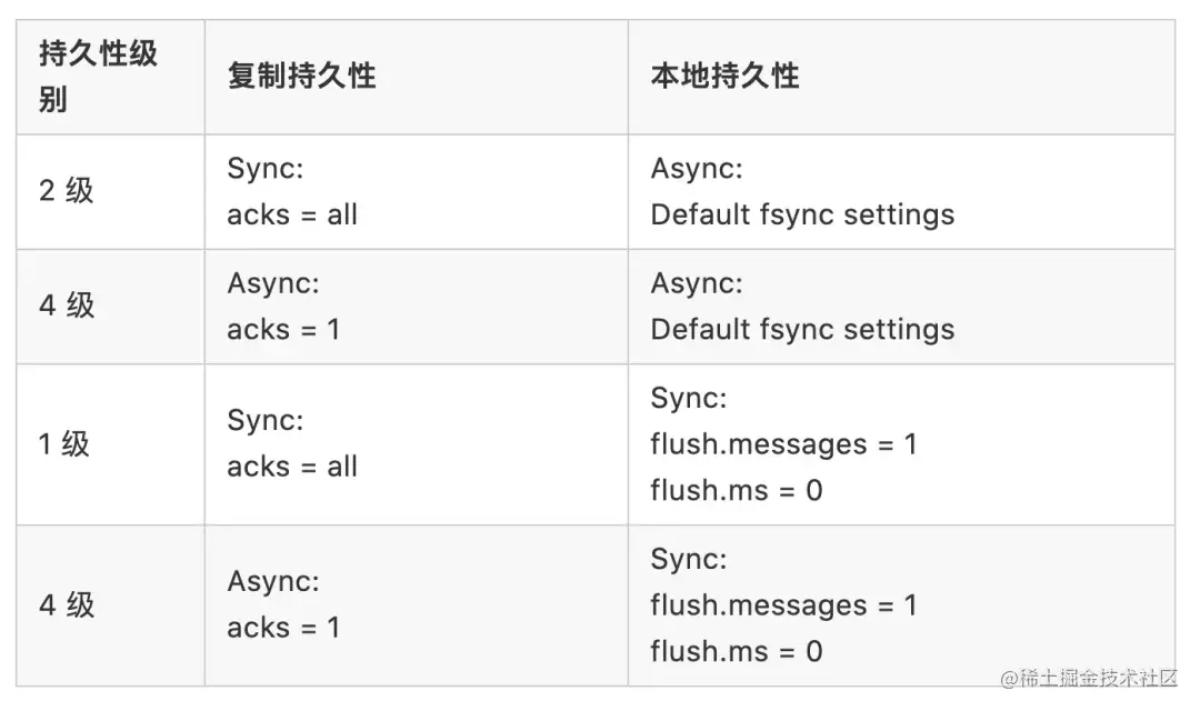 Kafka 提供 3 种持久性级别:1 级,2 级(默认设置)和 4 级。Kafka 在 2 级提供复制持久性,在 4 级无法提供持久性保证,因为不具备在确认写入之前将数据 fysnc 到磁盘的能力。通过设置 flush.messages=1 和 flush.ms=0,Kafka 可以达到 1 级系统级别,但 Kafka 几乎没有在生产环境部署过这种配置。
