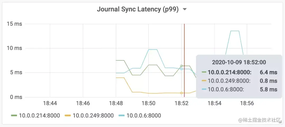 在进行延迟相关测试时,重要的是捕获 NVMe SSD 上的 fsync 延迟。我们观察到,这 3 个实例的 P99 fsync 延迟在 1 毫秒到 6 毫秒之间,如下图所示。如前所述,不同情况下磁盘发生很大差异,主要体现在该延迟中,我们发现有一组实例延迟一致。