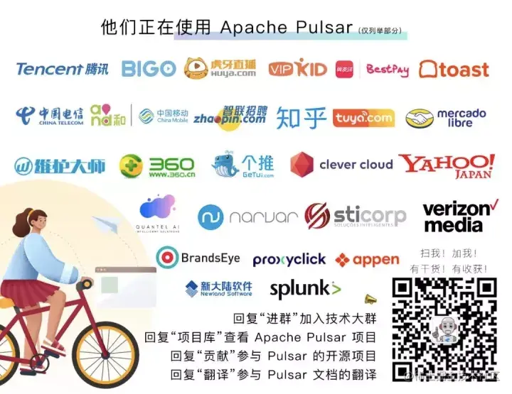 Apache Pulsar 是 Apache 软件基金会顶级项目,是下一代云原生分布式消息流平台,集消息、存储、轻量化函数式计算为一体,采用计算与存储分离架构设计,支持多租户、持久化存储、多机房跨区域数据复制,具有强一致性、高吞吐、低延时及高可扩展性等流数据存储特性。当前已有众多国内外大型互联网和传统行业公司采用 Apache Pulsar,案例分布在人工智能、金融、电信运营商、直播与短视频、物联网、零售与电子商务、在线教育等多个行业,如美国有线电视网络巨头 Comcast、Yahoo!、腾讯、中国电信、中国移动、BIGO、VIPKID 等。