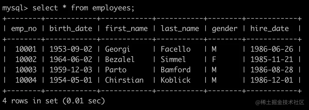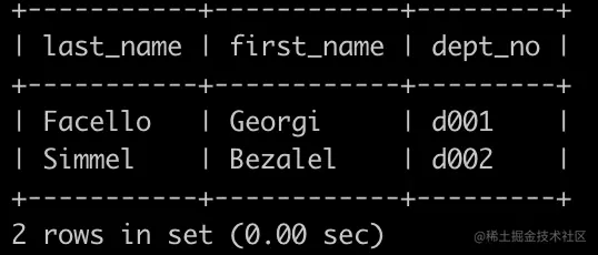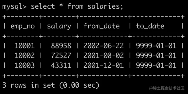 WHERE 的条件不加也可以,但真实场景下是要加的,因为要排除已离职的员工(to_date != '9999-01-01')。最后通过 emp_no 升序排序。