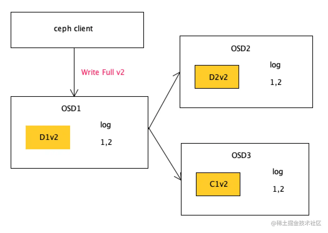 D2v1表示对象版本1的数据块2 写入了OSD2