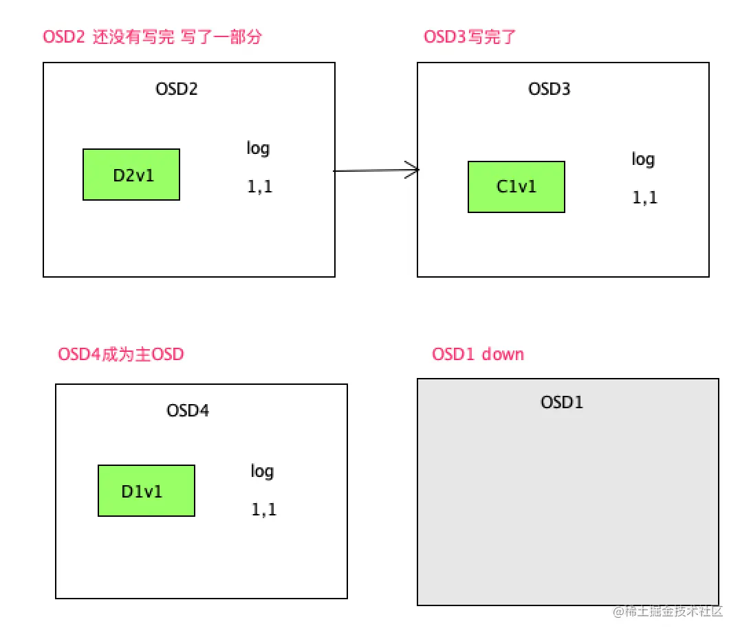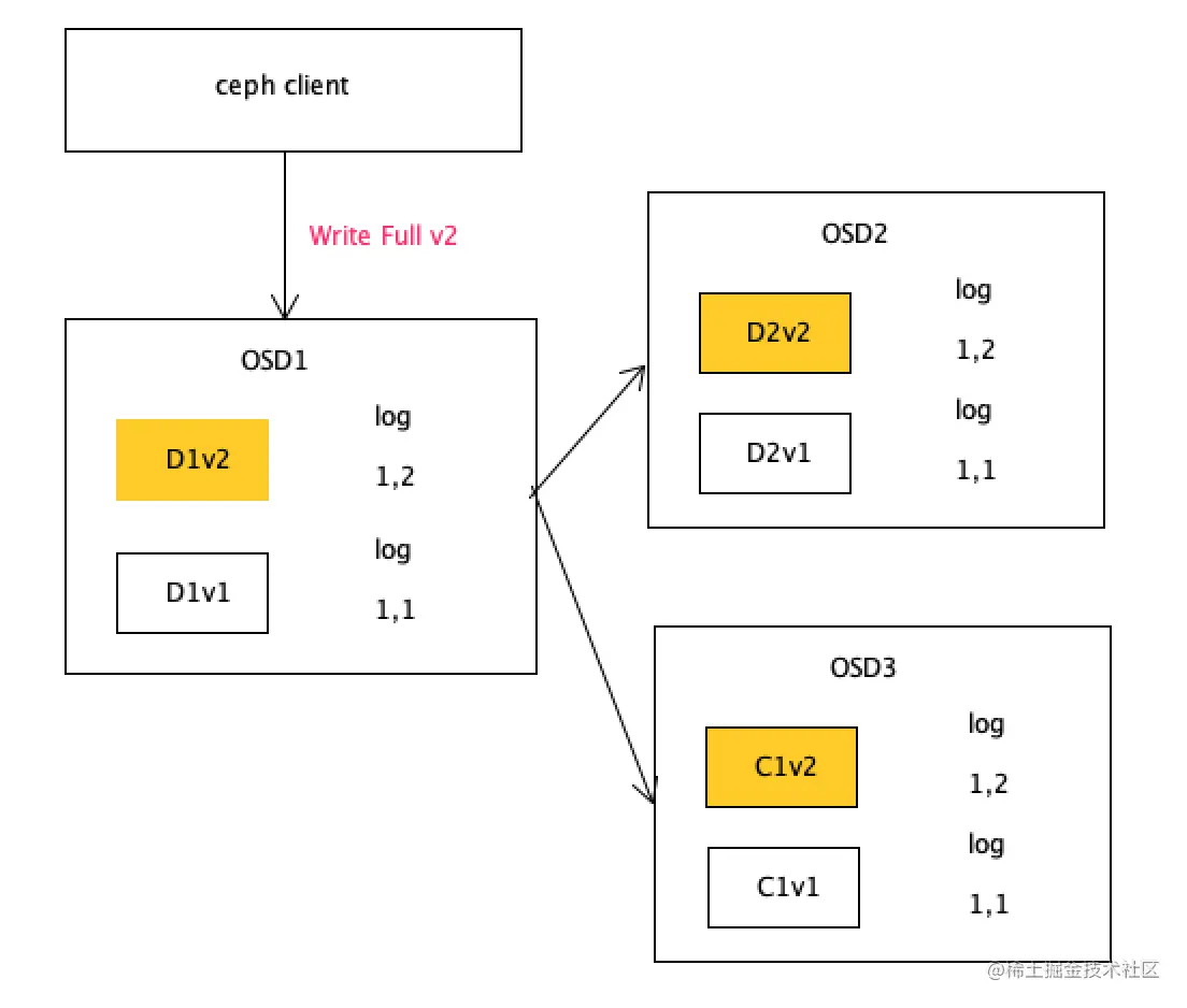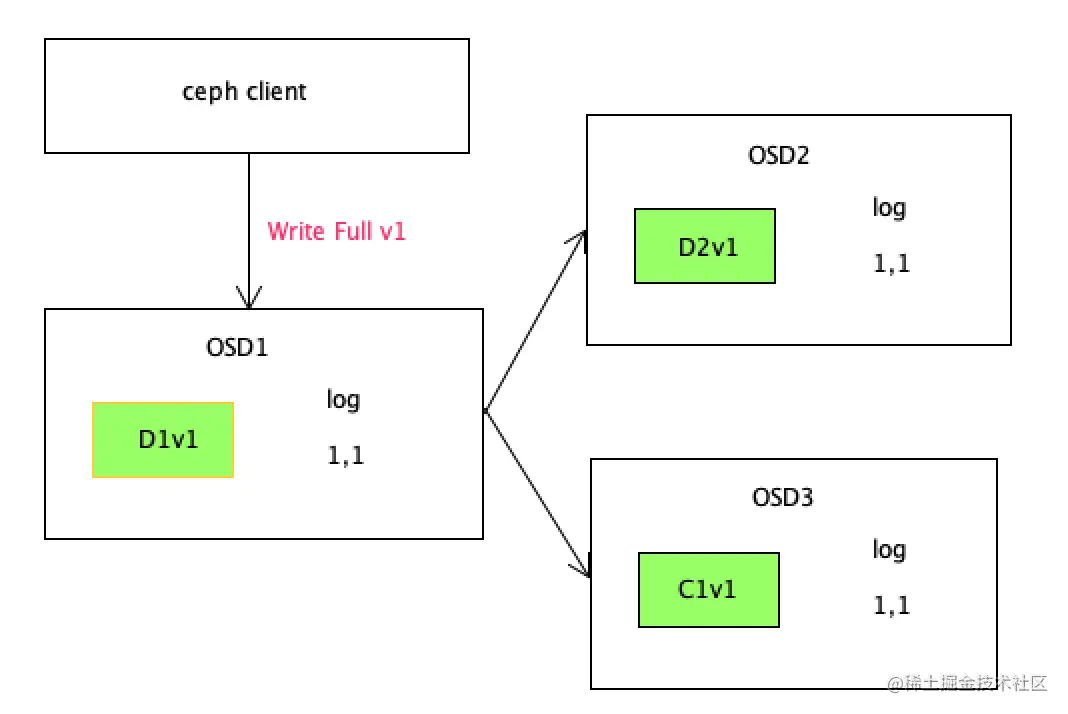 D1v1表示对象版本1的数据块1 写入了OSD1