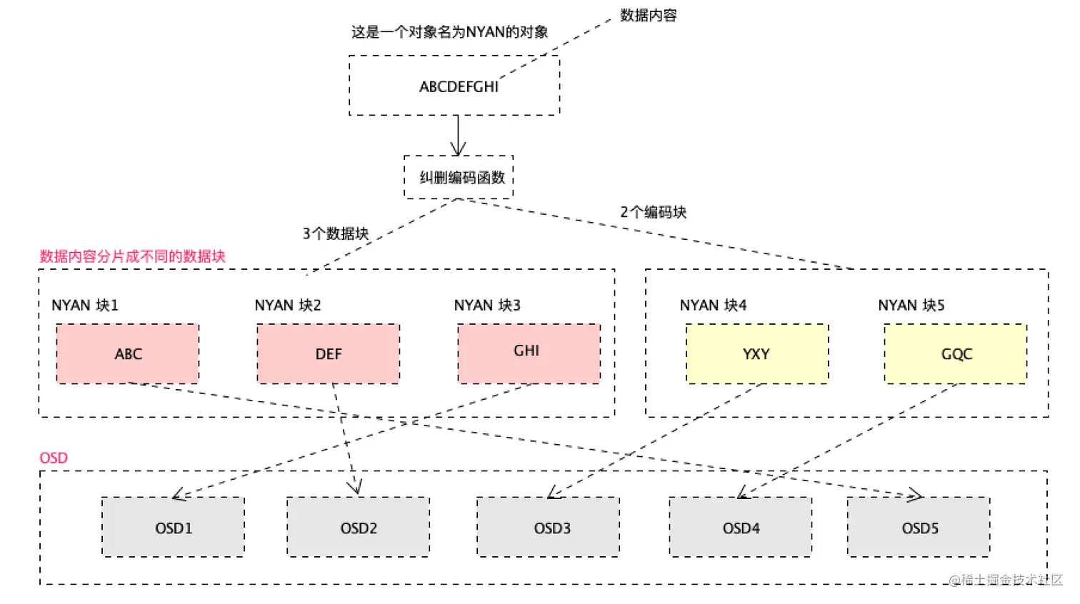 纠删编码函数将对象内容划分为3个数据块和2个编码块
