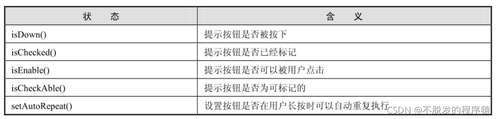 按钮的基类是QAbstractButton,提供了按钮的通用性功能。但是它不能实例化,必须由其他的按钮类继承QAbstractButton类,来实现不同的功能、不同的表现形式。