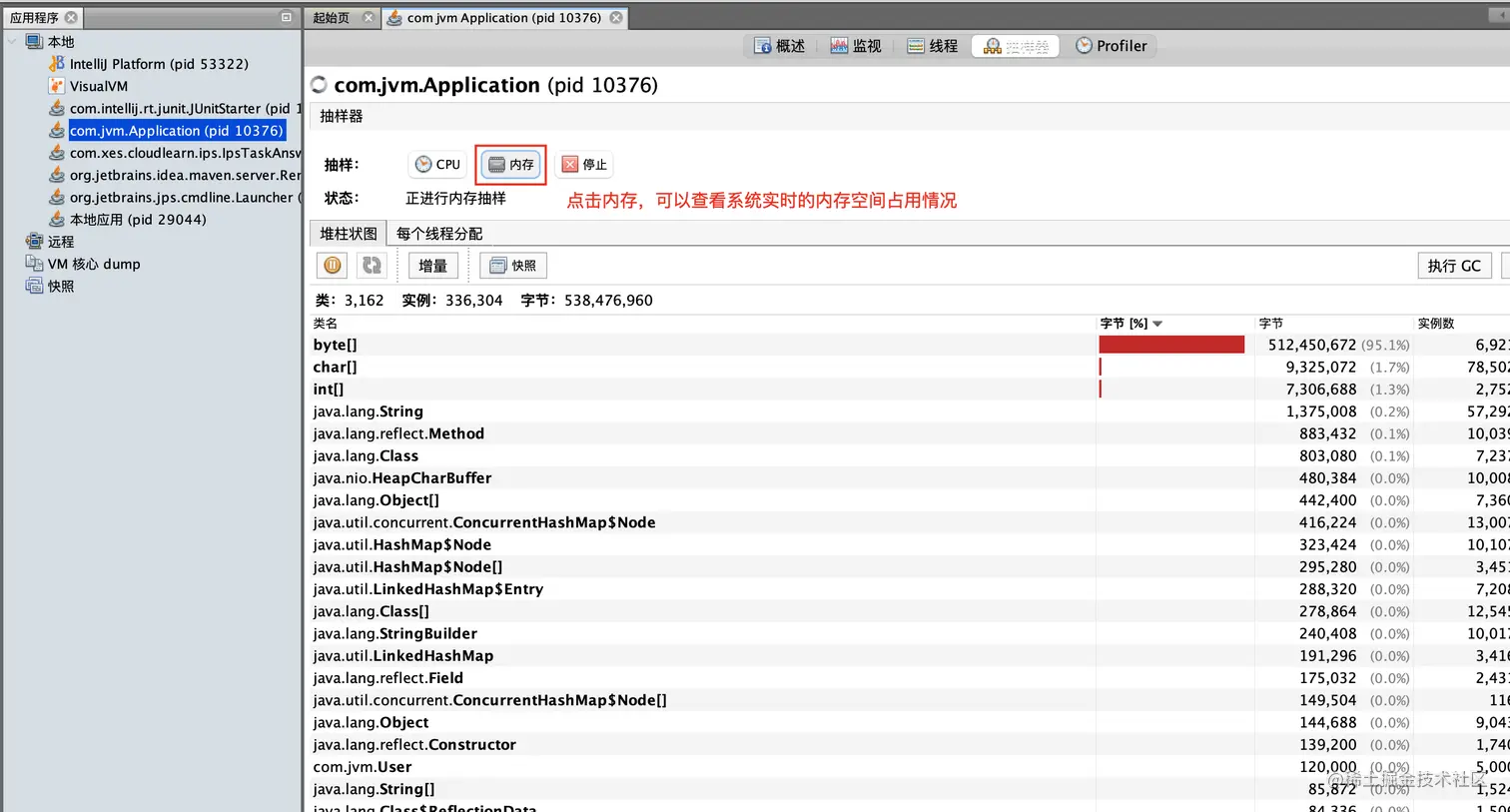 点击内存,就可以实时查看到系统进程的内存占用情况。点击内存其实就是对 【jmap -histo 进程ID】命令的包装