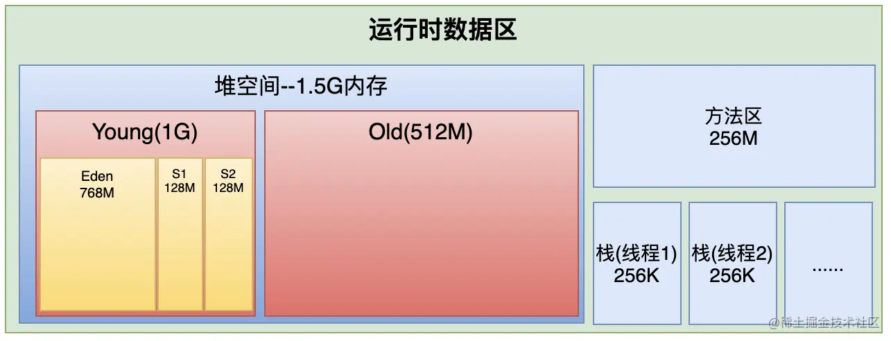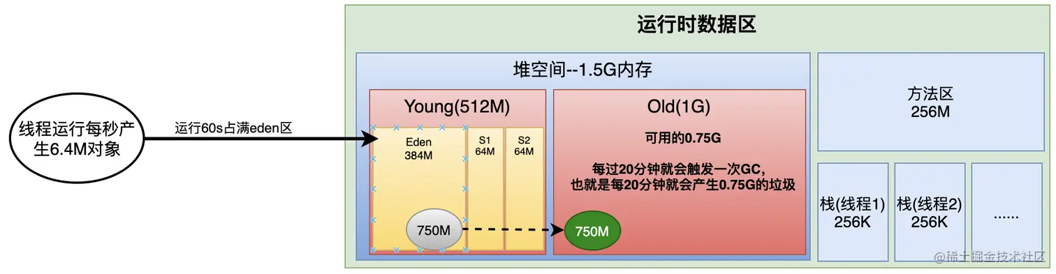 根据参数我们梳理如下内存模型。堆内存空间都分配好了,那么上面说了每过60s触发一次Young GC,那么就是说,平均每秒会产生384/60=6.4M的垃圾。而老年代,每过20分钟就会触发一次GC,而老年代可用的内存空是0.75G,也就是750多M。